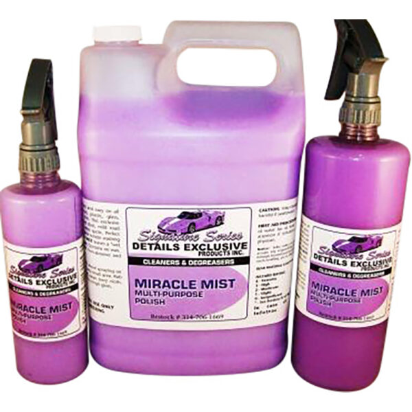 Signature Series Miracle Mist is a multi-purpose polish that works fast and easy on all painted surfaces, clear coat, plastic, glass, metal, vinyl, and rubber trim. This exclusive formula will safely remove dust, mild road grime, fingerprints and water spots. Perfect for spot washing or complete vehicle washing with water. Miracle Mist leaves a wet-look shine. Body shop safe. Contains no wax. Anti-static and anti-streak. Non-abrasive and non-silicone. Miracle Mist should be used when claying the exterior paint surface, to insure the life of the clay bar.